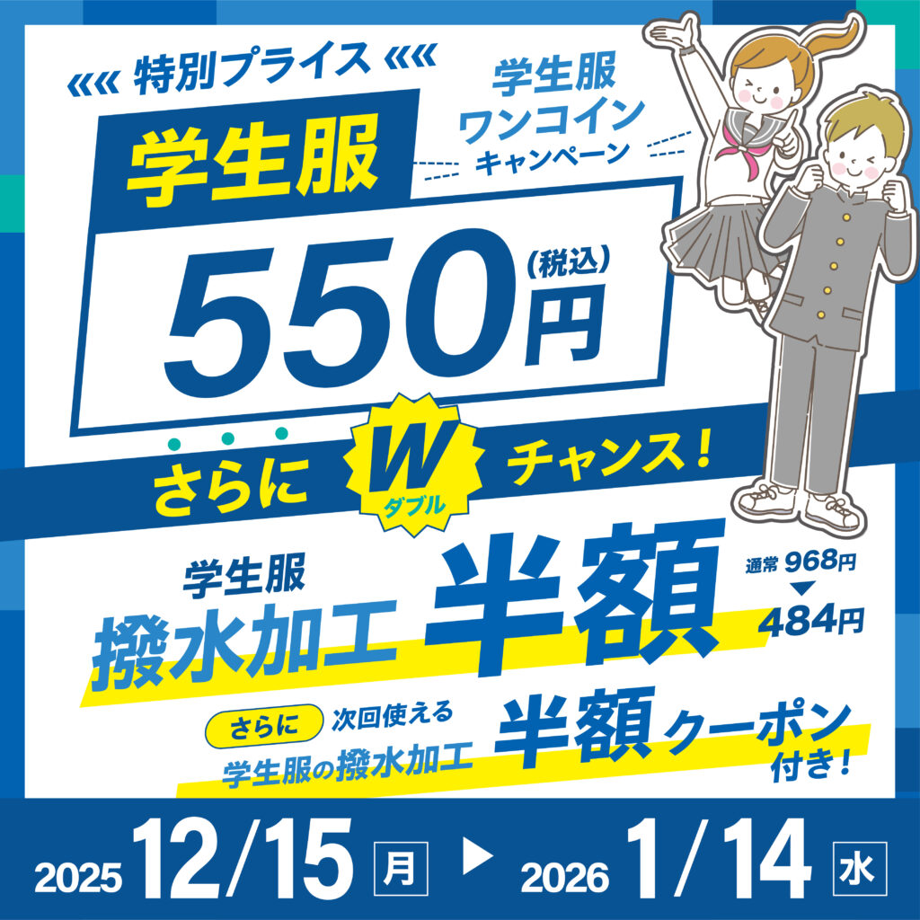 【年末年始特別企画】学生服 ワンコイン&撥水加工キャンペーン!