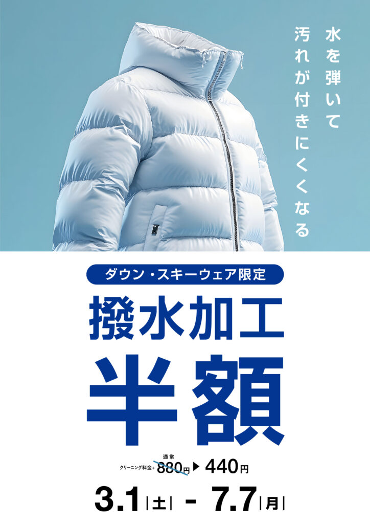 ダウン・スキーウェア限定で、撥水加工を半額にて承ります。